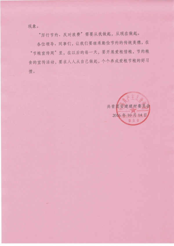 每年的10月16日是世界糧食日,每年世界糧食日所在周為全國愛惜糧食節(jié)約糧食宣傳周。安建建材團委通過張貼節(jié)糧倡議書、發(fā)放愛糧節(jié)糧宣傳卡片、征集愛糧節(jié)糧宣言等方式廣泛引導、帶動全體員工積極參與,大力宣傳愛糧節(jié)糧科學知識,號召大家養(yǎng)成居安思危、處豐思歉、惜糧如金、節(jié)糧成習的良好風尚,從我做起、從身邊做起,減少糧食的損失與浪費。