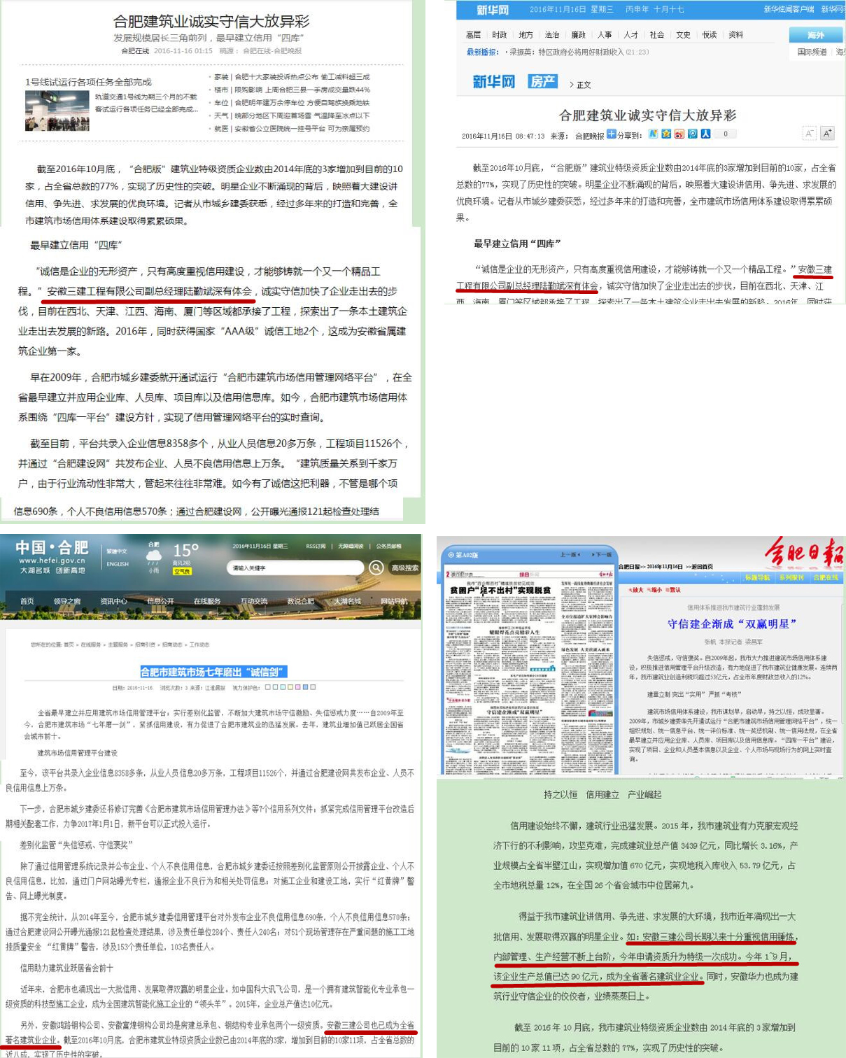 為貫徹落實(shí)“2016信用中國宣傳月活動”工作部署,近日,合肥人民廣播電臺等新聞媒體的記者到安徽三建就公司質(zhì)量立企,誠信經(jīng)營進(jìn)行采訪報道。新華網(wǎng)、鳳凰網(wǎng)、建筑培訓(xùn)網(wǎng)、合肥晚報、合肥日報及江淮晨報等分別以題為《合肥建筑業(yè)誠實(shí)守信大放異彩》、《守信建企漸成“雙贏明星”》及《合肥市建筑市場七年磨出“誠信劍”》等紛紛進(jìn)行轉(zhuǎn)載報道。