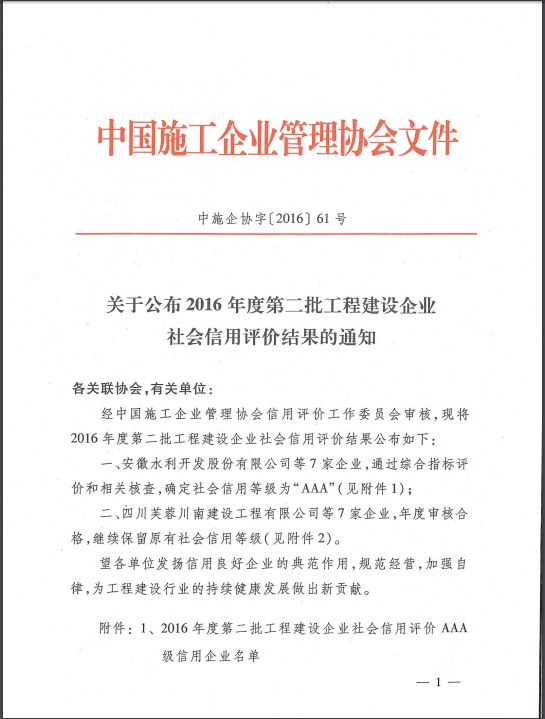 經(jīng)中國(guó)施工企業(yè)管理協(xié)會(huì)信用評(píng)價(jià)工作委員會(huì)審核,安徽水利開(kāi)發(fā)股份有限公司被授予2016年度第二批工程建設(shè)企業(yè)社會(huì)信用評(píng)價(jià)AAA級(jí)信用企業(yè)單位。