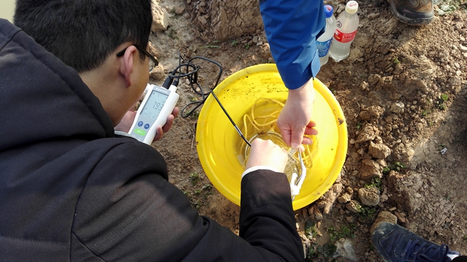 課題組一行在聽取項目概況和有關介紹后,實地察看了中湖地質(zhì)環(huán)境治理項目(一期、二期)總體控制性詳細規(guī)劃區(qū)域。根據(jù)察看結(jié)果和背景資料,分析了該科研項目當前緊迫的任務、現(xiàn)場地形地貌和周邊環(huán)境(特別是水系和塌陷區(qū)采空層情況),具體采樣工作包括采集土樣、水樣、沉降觀測點的選擇,并實時檢測了水樣的pH值等基礎指標等。