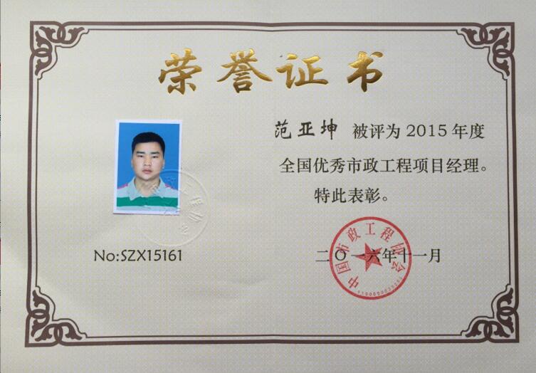 日前,從中國市政工程協(xié)會傳來喜訊,安徽三建市政公司范亞坤同志喜獲“2015年度全國優(yōu)秀市政工程項目經(jīng)理”稱號。