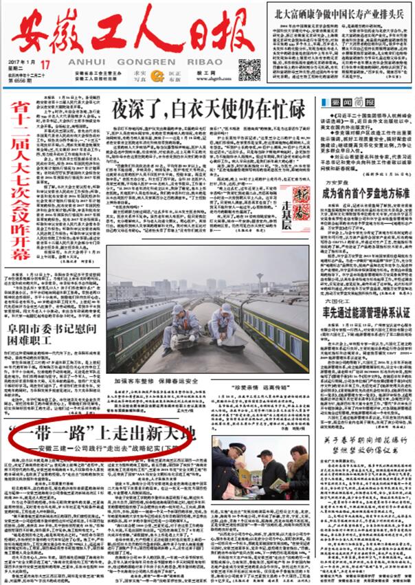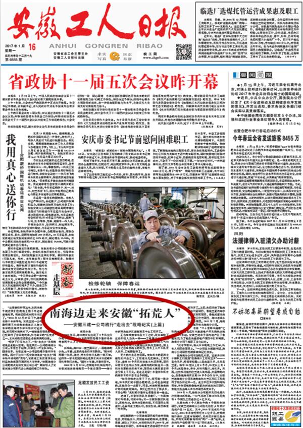 1月16、17日,《安徽工人日報(bào)》頭版先后刊登了兩篇題為《南海邊走來安徽“拓荒人”》、《“一帶一路”上走出新天地》的文章,對安徽三建一分公司多年來在海南地域拼搏開拓取得成功的過程做了詳細(xì)報(bào)道。