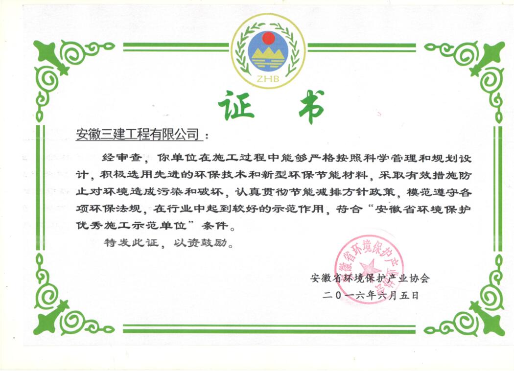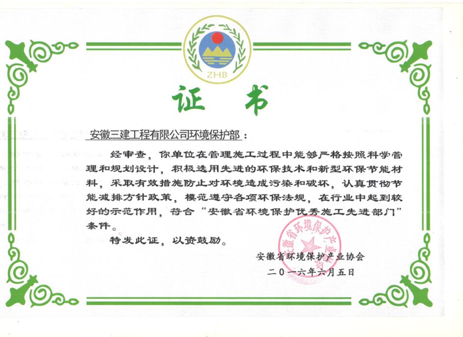近日,從安徽省環(huán)境保護產(chǎn)業(yè)協(xié)會獲悉,安徽三建公司榮獲“2016年度安徽省環(huán)保優(yōu)秀施工示范單位”稱號;同時,該司環(huán)境保護部被評為“安徽省環(huán)境保護優(yōu)秀施工先進部門”。此項榮譽的獲得,是省環(huán)境保護協(xié)會對我公司在項目建設中堅持綠色施工、注重環(huán)境保護工作的充分肯定。