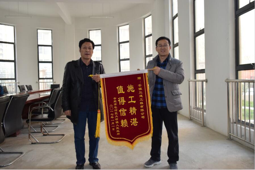 1月22日,合肥市包河區(qū)大圩鎮(zhèn)人民政府常務(wù)副鎮(zhèn)長(zhǎng)、黨委委員丁傳富同志代表鎮(zhèn)政府在大圩金葡萄家園三標(biāo)段項(xiàng)目現(xiàn)場(chǎng),授予安徽三建工程有限公司“施工精湛,值得信賴”錦旗。感謝項(xiàng)目全體人員為大圩的建設(shè)所作出的突出貢獻(xiàn),代表大圩幾千名回遷業(yè)主感謝安徽三建(八公司)。