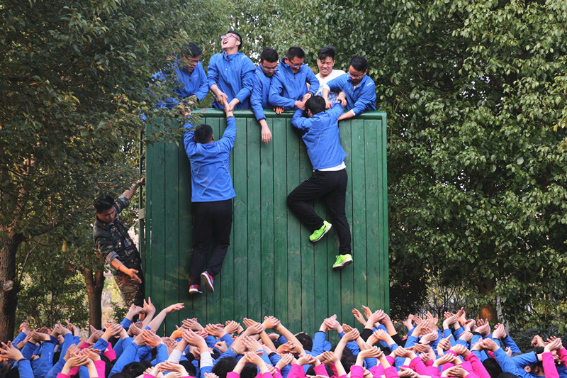 令人印象最深的是本次培訓的最后一個項目“畢業(yè)墻”活動,全體130名“受困”員工要在不借助外力的情況下,通過團隊力量,在20分鐘內徒手越過4米多高的垂直板墻“脫險”。一開始,許多人都感到信心不足。在張鍵董事長的帶領下,大家聚在一起研究方案,最后決定采用搭建三層人梯、定人定責、下推上拉的方式攀越板墻。“脫困”過程中,安建建材的小伙子們勇于擔當,沖鋒陷陣,以無畏奉獻的精神積極投入到同事的“營救”中,女同胞們在一旁舉起雙手,架起“防護網”,幫忙吶喊助威。困境之中,有勇當開路先鋒的、有甘當人墻的、有負責墊后的……大家團結協(xié)作、爭先恐后、共克難關,董事長張鍵更是以身作則,默默當起人墻,用堅實的肩膀托舉“遇困”員工翻越高墻,整個場面感人至深。通過高效的團隊協(xié)作、堅定必勝的信心,在短短的17分鐘內,所有“遇困”員工便被安全“營救”到高墻之外,沒有一名被落下?;顒幼詈?,所有人聚到了一起,看著小伙子們一個個漲紅的臉頰、被踩的印記鮮紅的肩膀,回憶著兩天來的點點滴滴……大家感受到了安建建材公司這個大家庭的溫暖,不禁熱淚盈眶,相擁到了一起、感動到了一起、心擰到了起……