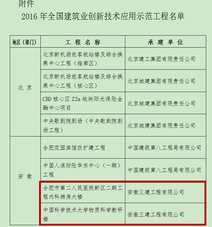 日前,從中國(guó)建筑業(yè)協(xié)會(huì)傳來(lái)喜訊,分別由安徽三建所屬四公司、八公司承建的中國(guó)科學(xué)技術(shù)大學(xué)物質(zhì)科學(xué)教研樓工程和合肥市第二人民醫(yī)院新區(qū)二期工程內(nèi)科病房大樓工程雙雙成功獲評(píng)“2016年全國(guó)建筑業(yè)創(chuàng)新技術(shù)應(yīng)用示范工程?!?/SPAN>