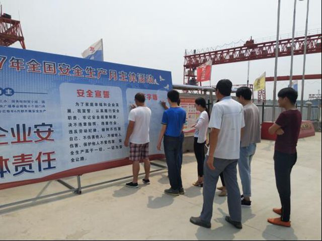 (圖為安徽路港滁淮預(yù)制標(biāo)項(xiàng)目部舉行“安全生產(chǎn)月”宣誓簽名活動)
