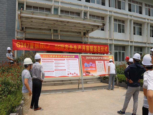 (圖為安徽路港G347普縱段項(xiàng)目部舉行“安全生產(chǎn)月”宣誓簽名活動)