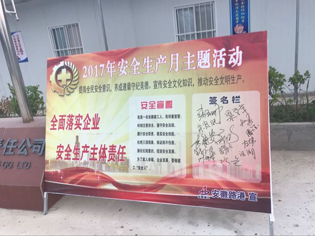 (圖為安徽路港合肥市郎溪路高架項(xiàng)目部舉辦“安全生產(chǎn)月”宣誓簽名活動)