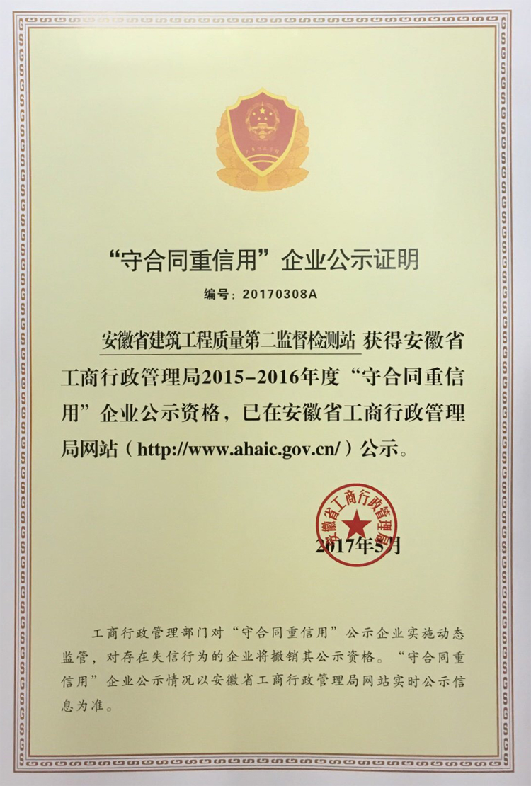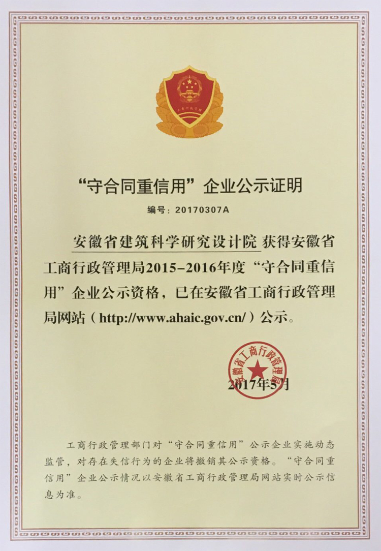 近日,經(jīng)安徽省工商行政管理局評定公示,安徽省建科院、省質(zhì)檢二站榮獲2015-2016年度省級“守合同重信用”企業(yè)榮譽(yù)稱號。