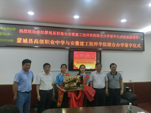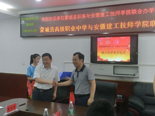 蒙城縣職高是安徽省首批國家重點職業(yè)高中、安徽省首批縣級職教中心、國家改革與發(fā)展示范校,在校生6000余人。與蒙城縣高級職業(yè)中學的成功合作,是安徽建工技師學院實施“高端引領、特色立?!卑l(fā)展戰(zhàn)略、創(chuàng)新高技能人才培養(yǎng)模式、密切校校合作、校企合作的重要舉措。