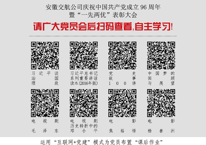 會后,安徽交航公司黨委為全體黨員布置了“課外作業(yè)”,即利用業(yè)余時間掃描二維碼自主學(xué)習(xí)習(xí)近平總書記系列重要講話特別是視察安徽重要講話精神以及黨的光輝歷史和最新時事政治。近年來,隨著“互聯(lián)網(wǎng)+”思維的不斷深化,安徽交航公司黨委有效運用“互聯(lián)網(wǎng)+黨建”模式開展各項工作,積極把“互聯(lián)網(wǎng)+”思維內(nèi)化為創(chuàng)新黨建工作的驅(qū)動力,主動搶占“指尖陣地”,努力打造“口袋黨建”!