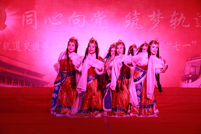 6月下旬,安徽交航合肥軌道交通4號(hào)線TJ03項(xiàng)目部接到演出邀請(qǐng)后,公司領(lǐng)導(dǎo)十分重視,公司工會(huì)積極組織職工排練節(jié)目。經(jīng)過5天的緊張排練,該節(jié)目順利通過合肥軌道公司的初審、二審,從38個(gè)節(jié)目中脫穎而出,成為15個(gè)參演節(jié)目中一朵靚麗的小花,在合肥5條軌道交通線四五十家施工企業(yè)中只有安徽交航、安徽路橋、中鐵四局等9家單位參演。歡快的舞曲、鮮明的節(jié)奏及歌頌的詞句展現(xiàn)出在解放西藏“一面進(jìn)軍、一面修路”的戰(zhàn)斗中,在實(shí)現(xiàn)民主改革的日子里,在邊疆自衛(wèi)反擊的戰(zhàn)場(chǎng)上,解放軍和藏族人民結(jié)下的魚水情意。演員們用飽滿的情緒和奔放的舞姿將演出推向高潮。