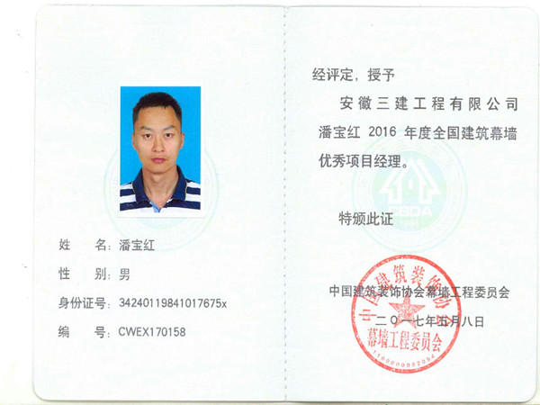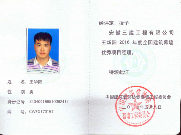 2017年6月在第十屆中國建筑幕墻設計師大會上,安徽三建裝飾公司王華陽、潘寶紅兩位同志榮獲“2017年中國建筑幕墻優(yōu)秀項目經(jīng)理”稱號。同時安徽省建筑裝飾協(xié)會在其官網(wǎng)上發(fā)布喜訊:該司萬和生、高莉等11名同志榮獲“2015-2016年度安徽省建筑裝飾優(yōu)秀項目經(jīng)理”稱號。