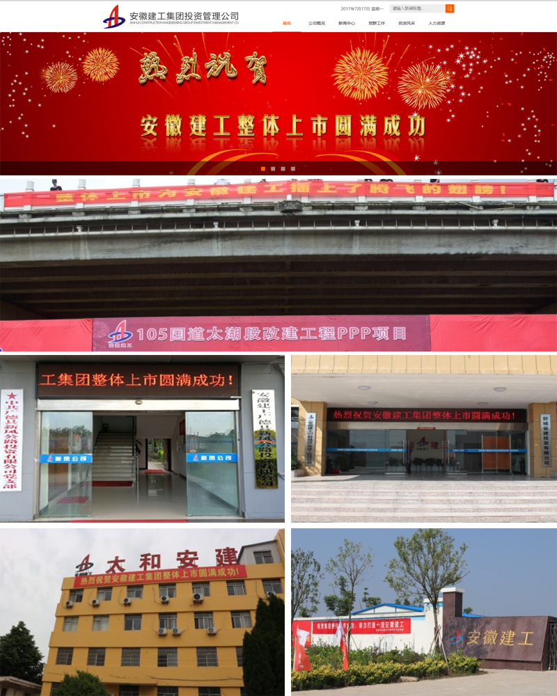 7月3日,安建投資公司網(wǎng)站當(dāng)即在首頁顯要位置推出集團(tuán)整體上市消息。各項目公司第一時間組織參建單位進(jìn)行標(biāo)語制作和展示,舒城安建、太和安建、廣德新鳳公司在項目公司駐地、施工一線現(xiàn)場通過標(biāo)語橫幅、LED、電子屏幕、宣傳欄、宣傳櫥窗、宣傳展板等各類媒介渠道進(jìn)行廣泛宣傳,及時將集團(tuán)上市信息傳遞到地方政府、主管部門、業(yè)務(wù)伙伴和一線施工人員當(dāng)中。除此之外,淮北安建還在淮北市入城主干道人民路旁懸掛橫幅6條并設(shè)置展示宣傳板、電子顯示屏各一塊,擴(kuò)大宣傳范圍,將宣傳工作落實到實處。