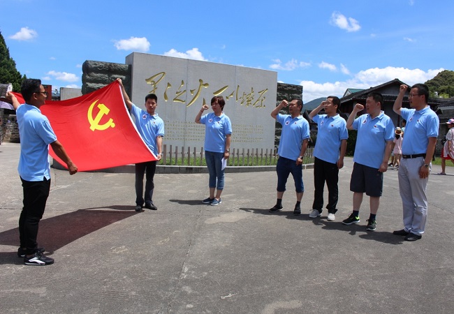 在主席園前,在鮮紅的黨旗下,面對“星星之火,可以燎原”的題詞,公司新入黨的4名黨員右拳高舉,莊嚴(yán)宣誓?!拔抑驹讣尤胫袊伯a(chǎn)黨,擁護(hù)黨的綱領(lǐng),遵守黨的章程,履行黨員義務(wù),執(zhí)行黨的決定,嚴(yán)守黨的紀(jì)律,保守黨的秘密,對黨忠誠,積極工作,為共產(chǎn)主義奮斗終身,隨時準(zhǔn)備為黨和人民犧牲一切,永不叛黨?!毙曼h員神情嚴(yán)肅認(rèn)真,聲音鏗鏘有力。