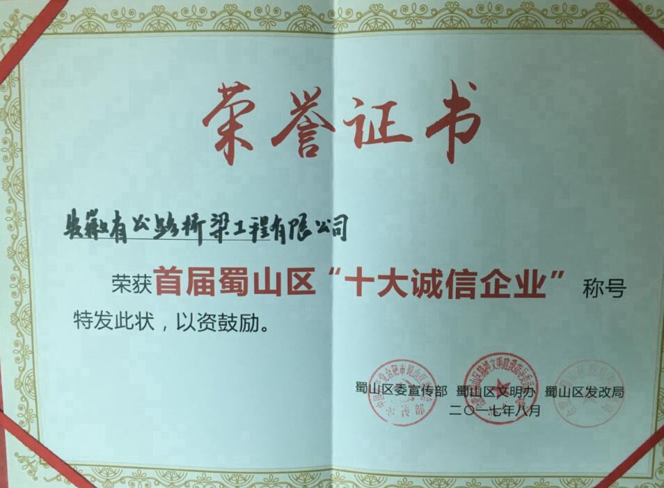 8月28日,由蜀山區(qū)委宣傳部、蜀山區(qū)文明辦、蜀山區(qū)發(fā)改局聯(lián)合主辦的首屆“十大誠信企業(yè)”和“十大誠信個人”頒獎活動在合肥隆重舉行,安徽路橋公司榮獲“十大誠信企業(yè)”稱號,區(qū)委書記李學(xué)明為公司頒獎,總經(jīng)濟師楊文柱代表公司出席大會并上臺接受領(lǐng)獎。