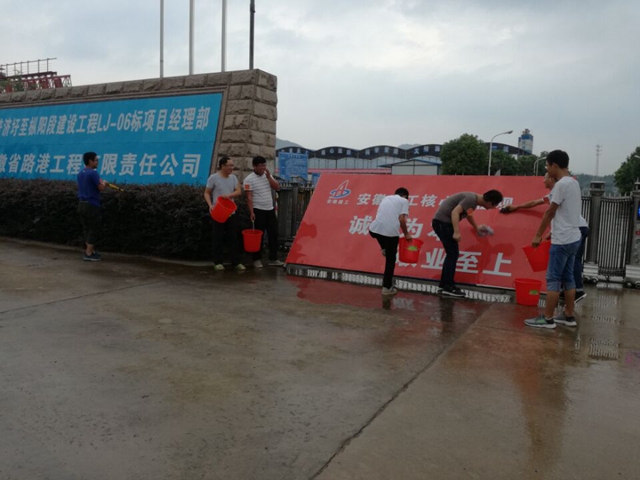 (圖為G347普縱段項(xiàng)目黨支部組織黨員、團(tuán)員青年清洗宣傳標(biāo)牌及安全標(biāo)識(shí)標(biāo)牌,整理擺放安全設(shè)施)