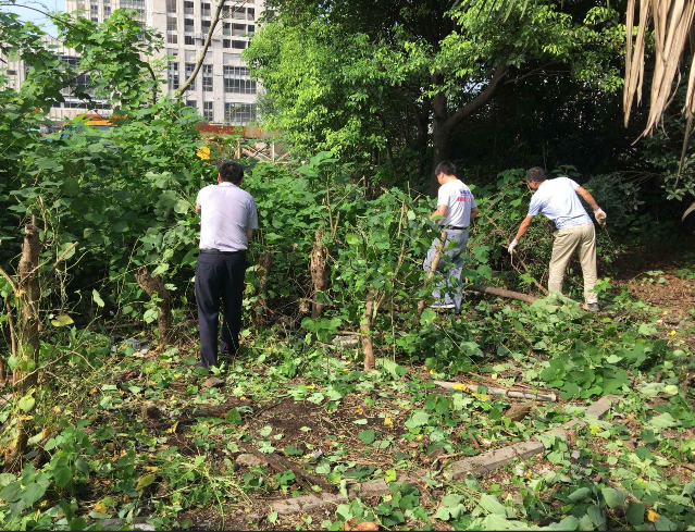 (圖為租賃分公司黨支部黨員組織黨員清理院內(nèi)衛(wèi)生)