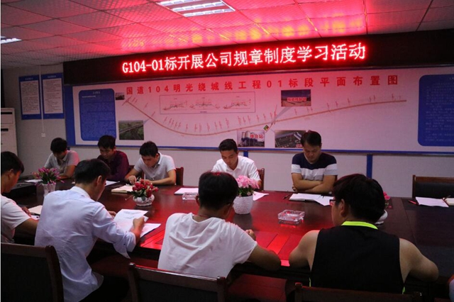 (圖為G104明光繞城線項(xiàng)目黨支部組織學(xué)習(xí)公司規(guī)章制度)