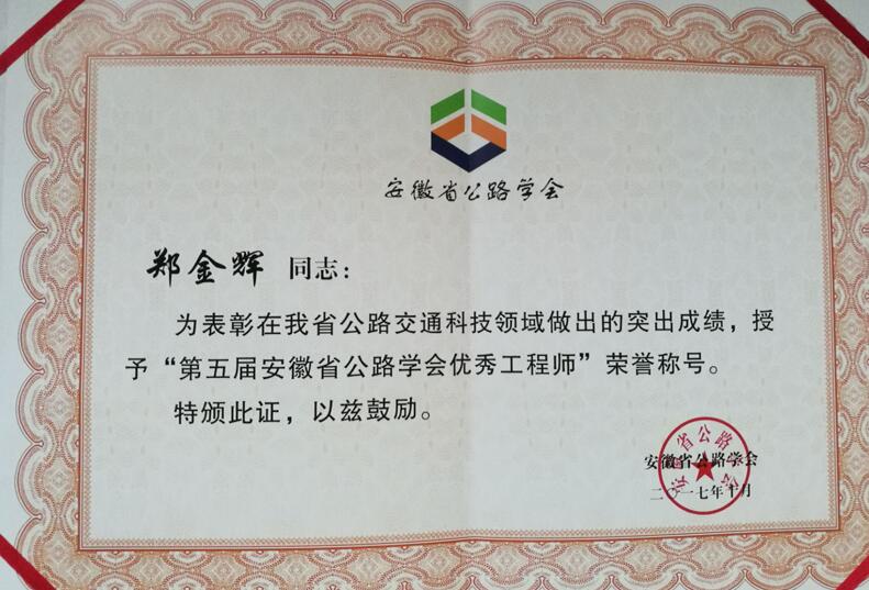 “安徽省公路學會優(yōu)秀工程師”是我省公路交通行業(yè)科技領域的學術(shù)和技術(shù)帶頭人,是全省公路交通行業(yè)優(yōu)秀工程技術(shù)人員的代表。