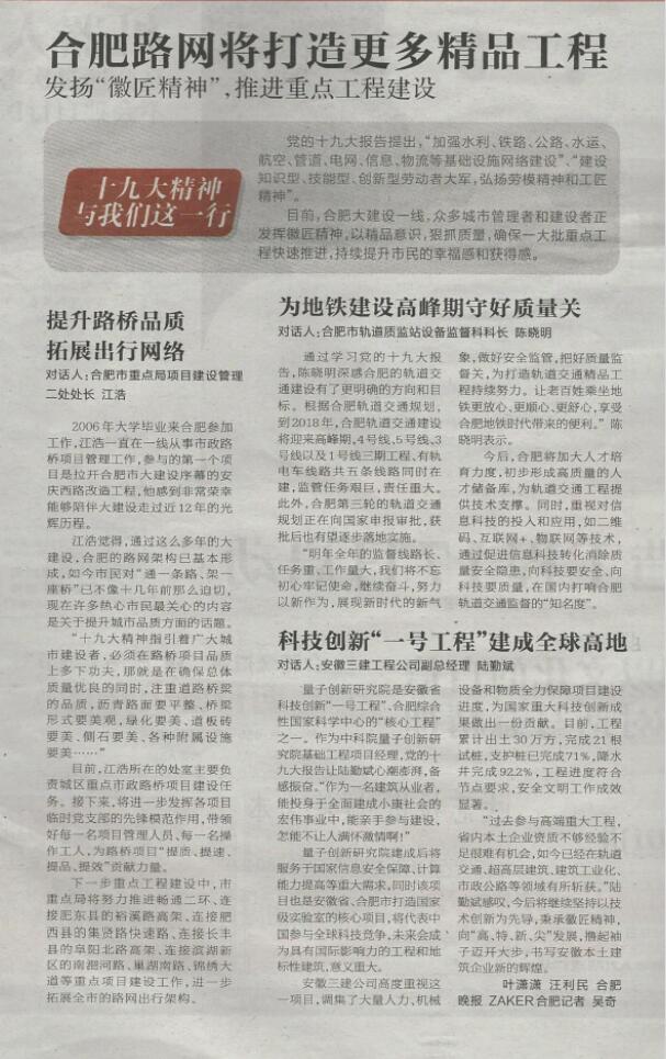 11月15日,合肥晚報A2版——“十九大精神在江淮”專版以《科技創(chuàng)新“一號工程”建成全球高地》為題,對話我公司黨委委員、副總經(jīng)理陸勤斌,暢談學習十九大精神的感受,引起了建筑行業(yè)的廣泛共鳴。