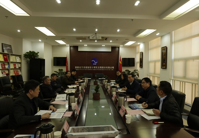 盛明宏董事長一行首先參觀了安徽省交通規(guī)劃設(shè)計(jì)研究總院股份有限公司,隨后雙方在省交規(guī)院會議室座談交流,洽談合作事宜。公司黨委委員、副總經(jīng)理歐陽志宜、黨委委員、總工程師王潔、黨委委員、副總經(jīng)理錢葉琳以及省交規(guī)院副總經(jīng)理王耀明、副總經(jīng)理陳修和等參加會談。