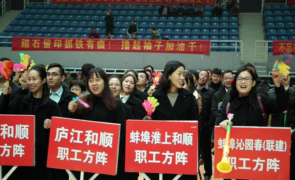 隨后,領(lǐng)導(dǎo)們走進職工方陣,與廣大職工一起,觀看來自和順地產(chǎn)及聯(lián)建單位職工獻唱的激揚歌曲《We are ready》。來自和順地產(chǎn)機關(guān)、蚌埠沁園春、蚌埠名都城和蚌埠和順等單位組建的和順地產(chǎn)啦啦隊們,為在場觀眾舞動青春,為運動員加油,現(xiàn)場氣氛歡快活躍。