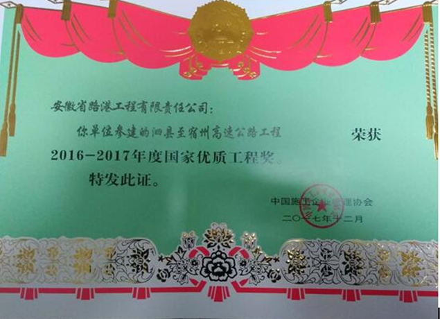 近日,安徽路港公司承建的泗宿高速10標在榮獲交通部優(yōu)質(zhì)工程“李春獎”基礎(chǔ)上,再次榮獲2016-2017年度國家優(yōu)質(zhì)工程獎,這也是安徽路港首次獲得該獎項。同時,徐士征同志被授予“國家優(yōu)質(zhì)工程突出貢獻者”榮譽稱號。
