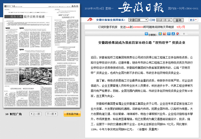 5月14日,安徽日?qǐng)?bào)第十版的財(cái)經(jīng)廣角版塊也較長(zhǎng)篇幅的報(bào)道了公司成功申報(bào)“雙特雙甲”資質(zhì),安徽日?qǐng)?bào)客戶端同步進(jìn)行報(bào)道。此外,安徽工人日?qǐng)?bào)也對(duì)此進(jìn)行了重點(diǎn)報(bào)道。