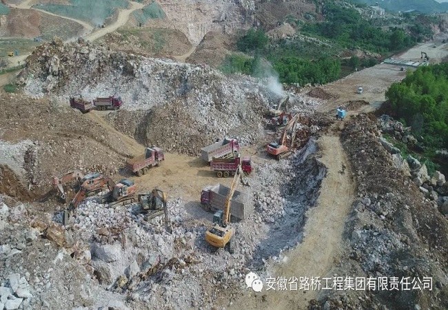 天石鈣業(yè)地處新杭服務(wù)區(qū)上行段,樁號(hào)K8+600-K8+800。這短短的200米范圍內(nèi)遍布著硬質(zhì)石山、低壓桿線、采石礦場(chǎng)、居民住房等,推進(jìn)難度十分巨大,為了加快進(jìn)度,項(xiàng)目部決定采用雙向推進(jìn)的方法,由大小樁號(hào)同時(shí)向中間開挖,投入大量機(jī)械,提高施工效率。由于該段內(nèi)多硬質(zhì)石山,必須采用爆破開采,受限于政府的炸藥管制政策,工作開展較慢。為此,項(xiàng)目部積極與政府有關(guān)部門溝通協(xié)調(diào),最終獲得了炸藥使用權(quán),并采用超深孔爆破的方法大大提升了開采速度。針對(duì)斷點(diǎn)內(nèi)的桿線、房屋問(wèn)題,項(xiàng)目部積極協(xié)調(diào),配合政府部門拆除紅線內(nèi)房屋,并在獲得相關(guān)部門批準(zhǔn)后,自行組織人員機(jī)械對(duì)桿線進(jìn)行遷移,掃清了工作推進(jìn)中的拆遷問(wèn)題。