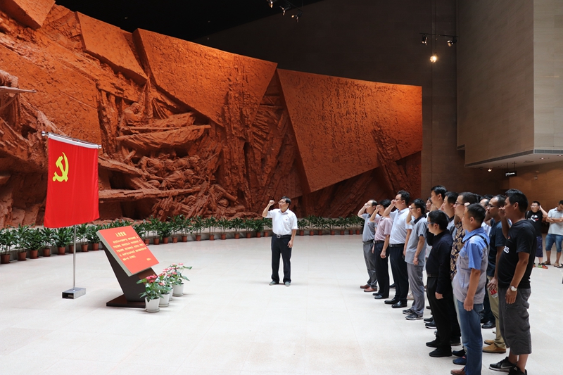 渡江戰(zhàn)役紀(jì)念館生動(dòng)再現(xiàn)了渡江戰(zhàn)役的艱難險(xiǎn)阻和我軍萬(wàn)船齊發(fā)勇渡長(zhǎng)江的英雄氣概,是我省重要的革命傳統(tǒng)教育基地。伴隨著生動(dòng)的解說(shuō),參加活動(dòng)的全體黨員先后參觀了渡江戰(zhàn)役總前委群雕,七大展廳、功勛長(zhǎng)廊及千余件珍貴的革命文物。在一件件珍貴的革命文物前,在一個(gè)個(gè)犧牲英烈的姓名前,同志們不時(shí)駐足凝望,在巨幅“勝利之師”浮雕前,同志們用注目禮深切向革命先烈們致以最崇高的敬意。在集團(tuán)公司總經(jīng)理助理、工程管理部主任、機(jī)關(guān)第三黨支部書(shū)記童宗勝領(lǐng)誓下,全體黨員面對(duì)鮮艷的中國(guó)共產(chǎn)黨黨旗重溫了入黨誓詞。