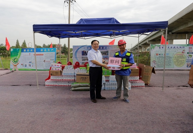 錢總一行來到項部施工現(xiàn)場看望和慰問奮戰(zhàn)在施工一線干部職工,為廣大職工送去藥品、飲料等防暑降溫物品。錢總對安徽路橋集團廣大職工戰(zhàn)高溫、斗酷暑,堅持在一線施工的艱苦奮斗精神給予高度贊揚,對項目部現(xiàn)階段工作給予了肯定,要求項目部要進一步加強管理,做好夏季施工防暑降溫工作,優(yōu)質(zhì)高效推進工程建設。