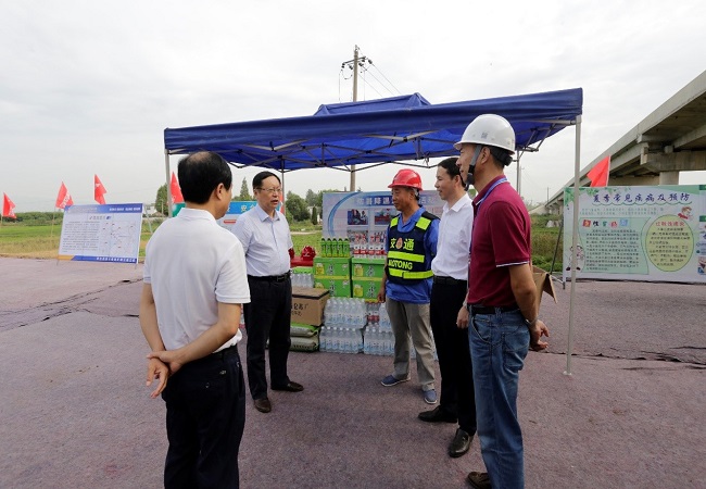 7月26日上午,省交控集團黨委副書記、總經(jīng)理錢東升在公司黨委書記、董事長、總經(jīng)理盛明宏、交控集團建設管理部部長蘇新國的陪同下,前往蕪合改擴建03標“送清涼”。公司總經(jīng)理助理、工程管理部經(jīng)理盧軍球以及項目辦、蕪合改擴建03標相關負責同志參加慰問活動。