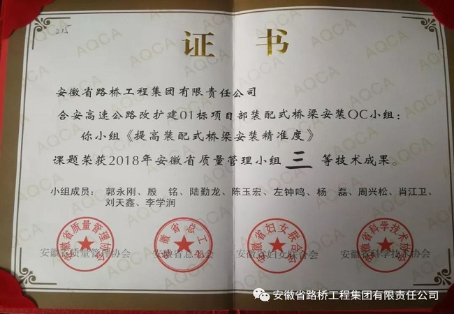 由公司選送的《提高裝配式橋梁安裝精準(zhǔn)度》 QC小組課題榮獲2018年安徽省質(zhì)量管理小組三等技術(shù)成果。裝配式橋梁尚屬于公路橋梁施工研究階段,此次QC小組活動(dòng)成功解決墩柱安裝存在的主要問(wèn)題,為后續(xù)裝配式橋梁施工提供了良好的施工經(jīng)驗(yàn),贏得了業(yè)主和監(jiān)理單位的好評(píng),提升了企業(yè)形象,取得了良好的社會(huì)效益。