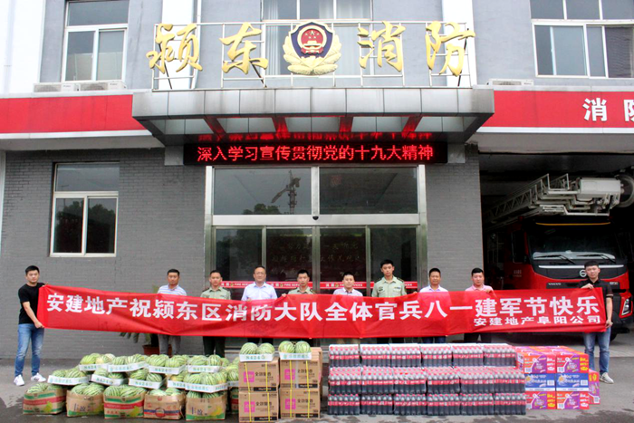 在第91個(gè)“八一建軍節(jié)”到來之際,7月27日上午,安建地產(chǎn)阜陽公司前往潁東區(qū)消防大隊(duì),慰問戰(zhàn)斗在一線的“逆行英雄”——消防戰(zhàn)士,并送去礦泉水、西瓜、飲料等消暑物品,向他們致以誠摯的問候和節(jié)日的祝福。