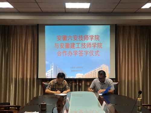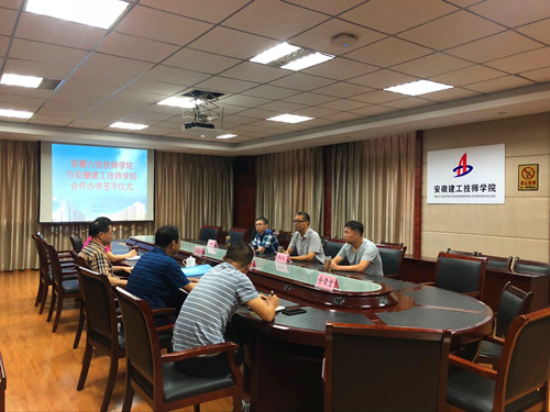 2018年8月17日上午,安徽建工技師學(xué)院與六安技師學(xué)院成教聯(lián)合辦學(xué)協(xié)議簽字儀式在安徽建工技師學(xué)院行政樓三樓會議室舉行。六安技師學(xué)院副院長姚運(yùn)林、教務(wù)處長李珍紅、成教辦主任任海鑫,安徽建工技師學(xué)院副院長任建設(shè)、招生就業(yè)處處長吳成群等共同出席簽約儀式。簽約儀式由任建設(shè)主持。
