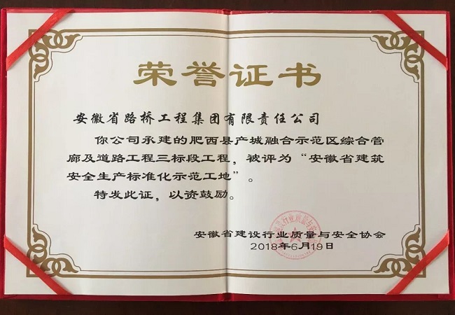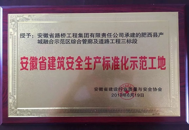 6月19日,安徽省建設(shè)行業(yè)質(zhì)量與安全協(xié)會下發(fā)了2018年度第一批安徽省建筑安全生產(chǎn)標(biāo)準(zhǔn)化示范工地(小區(qū))名單,并于近日完成了授牌。公司承建的肥西縣產(chǎn)城融合示范區(qū)綜合管廊及道路工程三標(biāo)段項目榮獲“省級安全生產(chǎn)標(biāo)準(zhǔn)化示范工地”稱號。