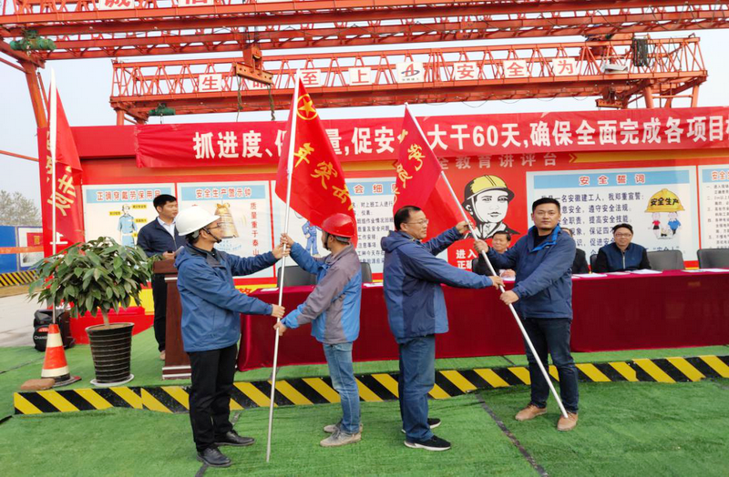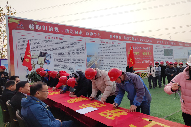 淮北S101項(xiàng)目舉辦勞動(dòng)競(jìng)賽啟動(dòng)儀式暨“大干六十天”誓師大會(huì) 11月12日,淮北安建交通建設(shè)有限公司舉辦勞動(dòng)競(jìng)賽啟動(dòng)儀式暨“大干六十天”誓師大會(huì)?;幢笔薪煌ň指本珠L(zhǎng)任士新、淮北市交通局工會(huì)主席丁道杰等地方政府主管部門領(lǐng)導(dǎo)蒞臨現(xiàn)場(chǎng)參加活動(dòng)。聯(lián)合黨支部副書記劉建文、淮北市公路局副局長(zhǎng)謝世忠分別向項(xiàng)目公司授予“黨員先鋒隊(duì)”和“青年突擊隊(duì)”旗幟,要求全體黨員團(tuán)員發(fā)揮模范帶頭作用,攻堅(jiān)克難,實(shí)現(xiàn)競(jìng)賽目標(biāo)。
