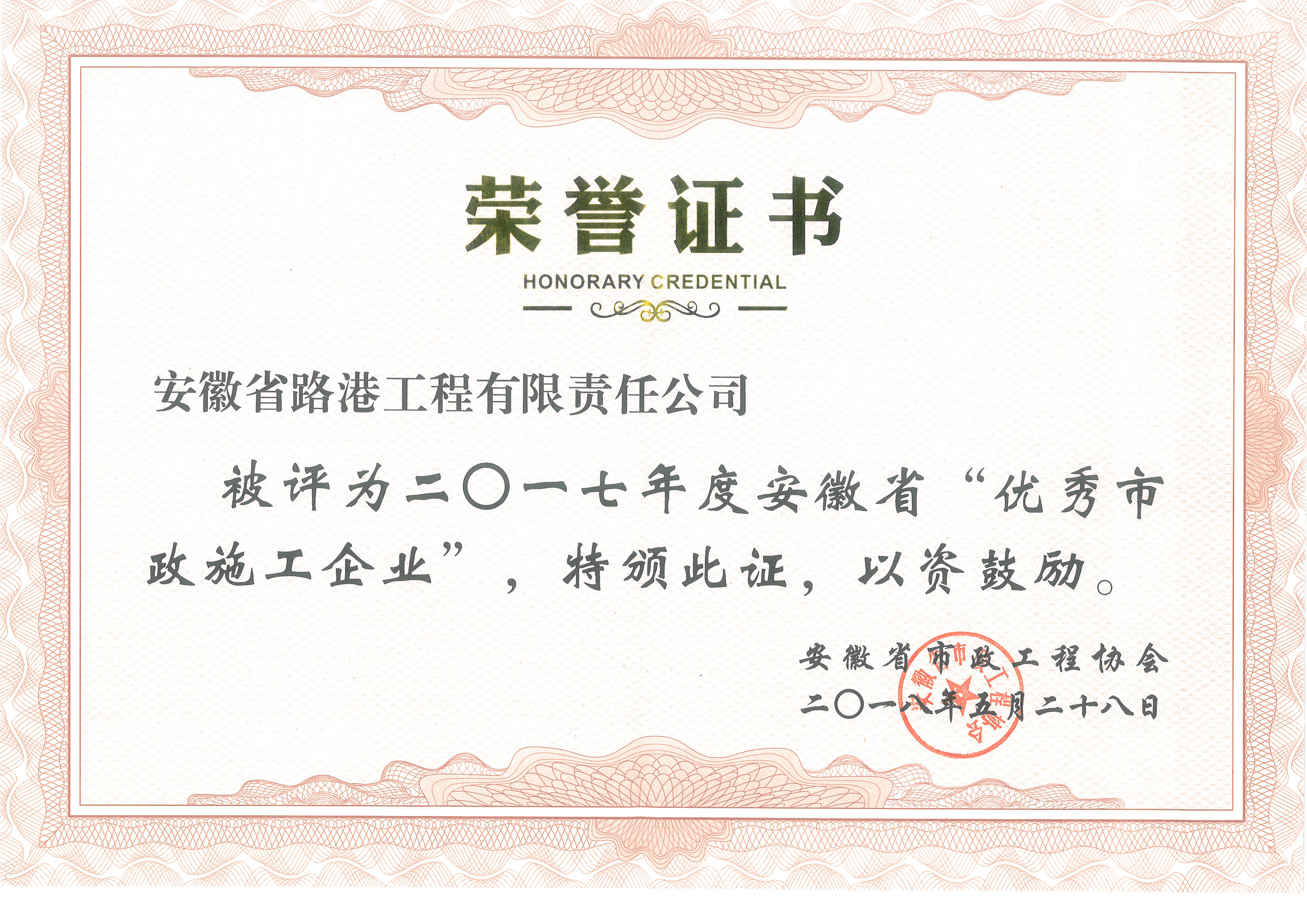 安徽省“優(yōu)秀市政施工企業(yè)”是安徽省市政行業(yè)企業(yè)管理的最高獎,獲獎企業(yè)經(jīng)濟(jì)指標(biāo)、社會效益良好,質(zhì)量管理、安全管理、科技進(jìn)步、誠信體系建設(shè)等方面取得實(shí)效。