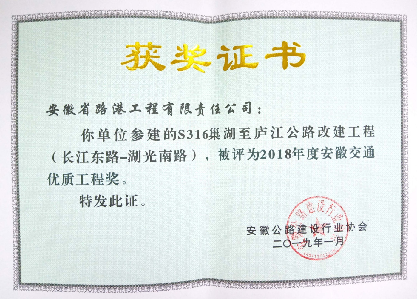 近日,從安徽公路建設(shè)行業(yè)協(xié)會(huì)傳來喜訊,安徽路港參建的S316巢湖至廬江公路改建工程榮獲2018年度安徽交通優(yōu)質(zhì)工程獎(jiǎng),全省共8個(gè)工程項(xiàng)目獲獎(jiǎng)。