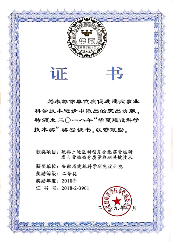 近日,2018年度華夏建設(shè)科學(xué)技術(shù)獎評獎工作落下帷幕。由安徽省建筑科學(xué)研究設(shè)計院研發(fā)完成的《硬黏土地區(qū)新型復(fù)合配筋管樁研發(fā)與管樁樁身質(zhì)量檢測關(guān)鍵技術(shù)》科研項目成果榮獲“華夏建設(shè)科學(xué)技術(shù)獎”二等獎。華夏建設(shè)科學(xué)技術(shù)獎是全國建設(shè)科學(xué)技術(shù)領(lǐng)域的最高獎項,安徽建科也是首次獲得華夏建設(shè)科學(xué)技術(shù)獎。