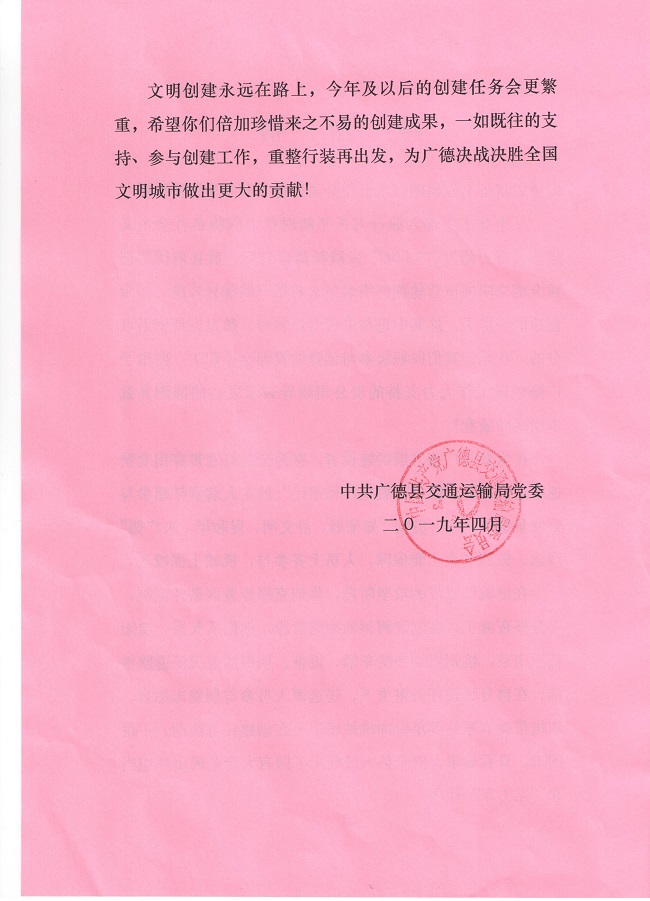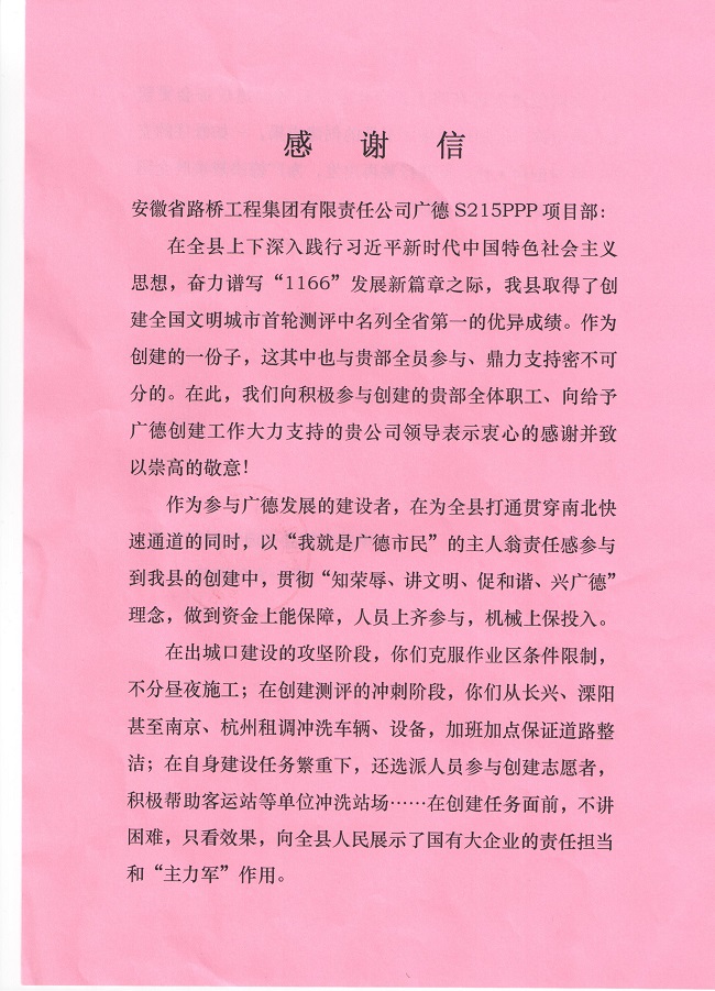 近日,公司收到廣德縣交通運(yùn)輸局發(fā)來的感謝信。信中對(duì)安徽路橋集團(tuán)廣德S15PPP項(xiàng)目部保質(zhì)保量完成項(xiàng)目建設(shè)目標(biāo)給予充分認(rèn)可和高度贊譽(yù),并對(duì)公司為廣德縣發(fā)展作出的努力和貢獻(xiàn)表示衷心感謝。