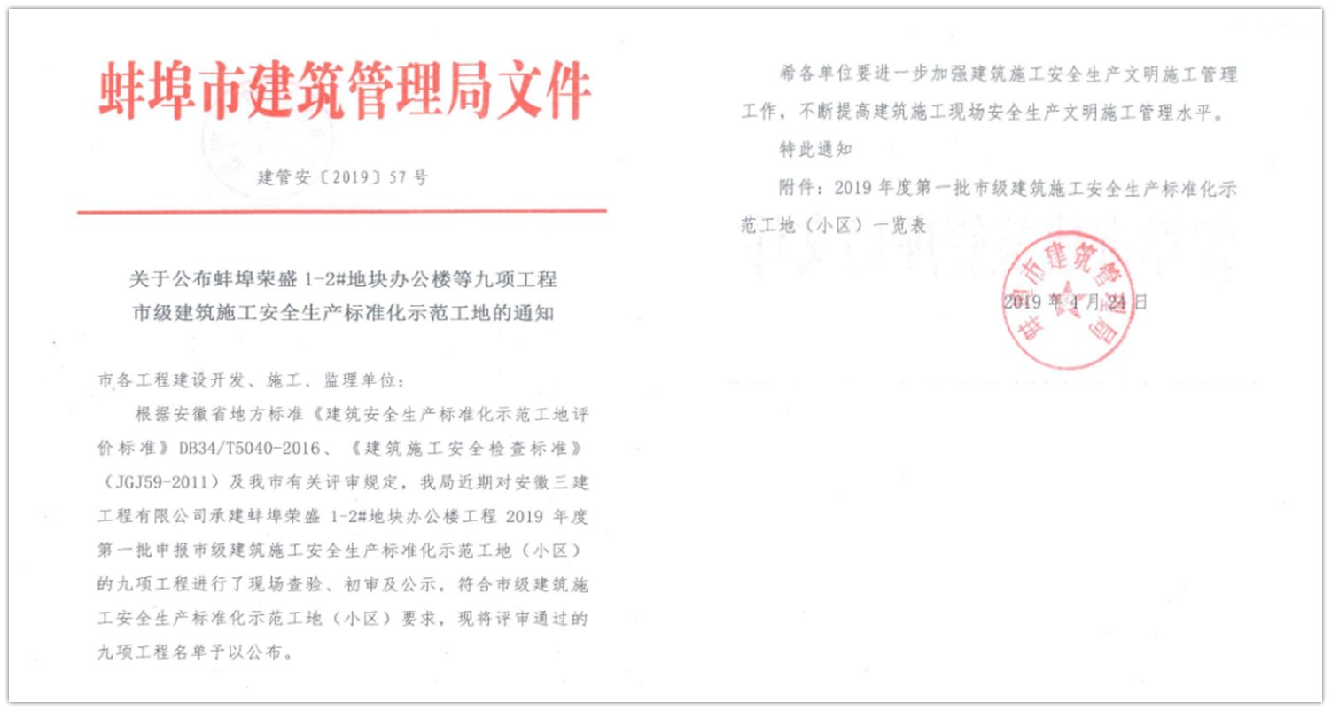 經(jīng)過(guò)集體論證評(píng)審,驗(yàn)收專家組一致認(rèn)為南城區(qū)四期路網(wǎng)項(xiàng)目達(dá)到了蚌埠市市級(jí)建筑施工安全生產(chǎn)標(biāo)化示范工地創(chuàng)建工作確定的各項(xiàng)任務(wù)與目標(biāo),同意此項(xiàng)目通過(guò)蚌埠市級(jí)建筑施工安全生產(chǎn)標(biāo)準(zhǔn)化示范工地驗(yàn)收。