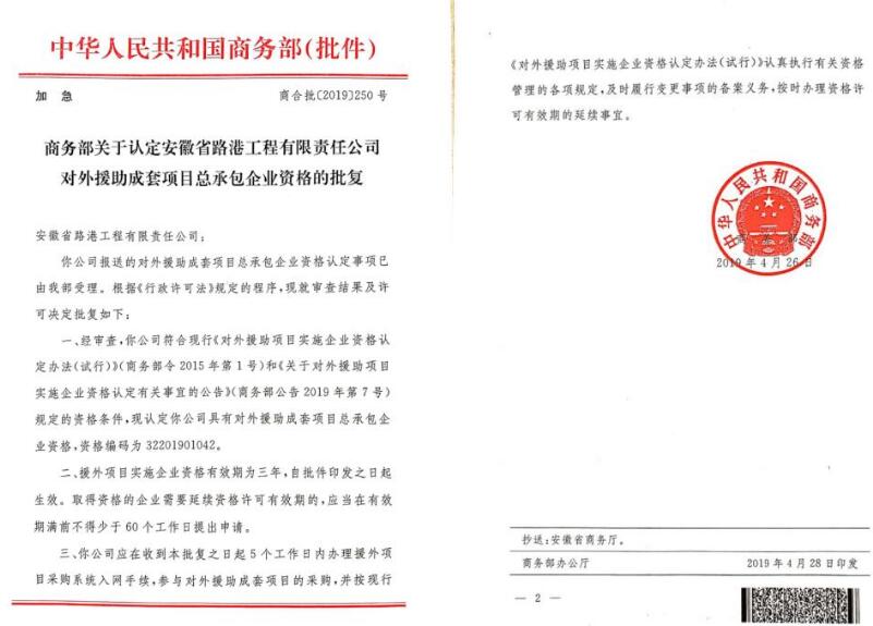 近日,安徽路港公司收到商務(wù)部下發(fā)的《商務(wù)部關(guān)于認(rèn)定安徽省路港工程有限責(zé)任公司對(duì)外援助成套項(xiàng)目總承包企業(yè)資格的批復(fù)》(商合批[2019]250號(hào)),獲得對(duì)外援助成套項(xiàng)目總承包企業(yè)資格。此次成功獲批對(duì)安徽路港公司承攬國家層面援外項(xiàng)目,開展國際化經(jīng)營和實(shí)現(xiàn)健康可持續(xù)發(fā)展具有重要意義。