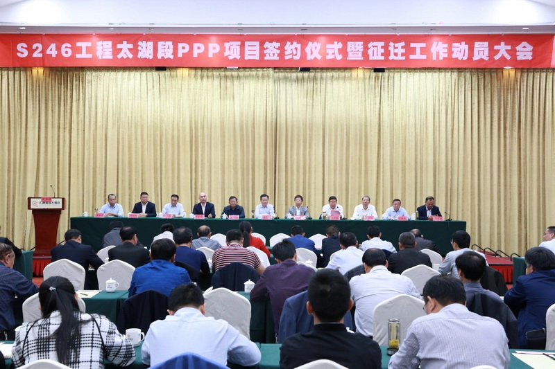 10月21日上午, S246工程太湖段PPP項目簽約儀式暨拆遷工作動員會在太湖縣成功舉行。安徽建工集團股份有限公司董事長王厚良、太湖縣委書記程志翔分別在儀式上致辭, 會議由太湖縣委常委、常務副縣長陳時彪主持。安徽建工集團投資公司總經(jīng)理朱忠明、太湖縣交通運輸局局長黃東升、太湖縣交通投資有限公司董事長黃華以及安徽省高路建設有限公司黨委書記、董事長胡紅雨代表雙方簽署了合作協(xié)議。