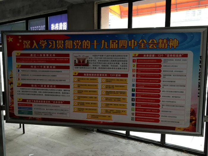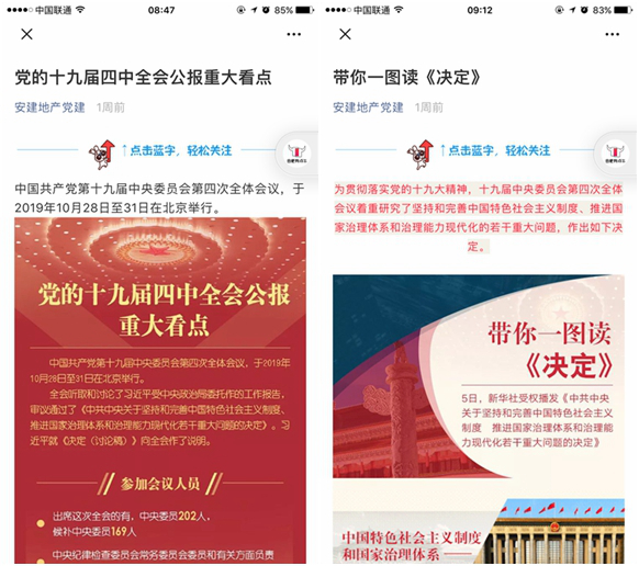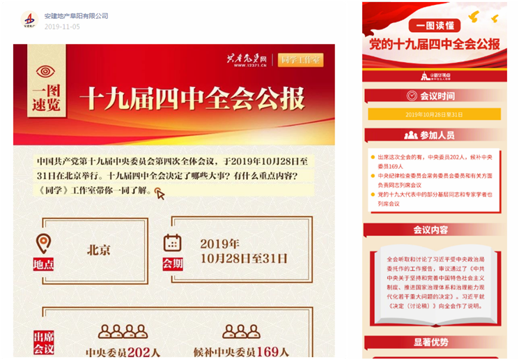安建地產(chǎn)各支部充分利用宣傳陣地和信息化手段,通過電子顯示屏、宣傳欄、展板等多載體營造濃厚的學習貫徹全會精神輿論氛圍?!鞍步ǖ禺a(chǎn)黨建”、“安建地產(chǎn)阜陽有限公司”微信公眾號發(fā)布“黨的十九屆四中全會公報重大看點”、“帶你一圖讀決定”、“一圖速覽十九屆四中全會公報”,其他支部通過QQ群發(fā)布“一圖讀懂黨的十九屆四中全會公報”,以圖文并茂、通俗易懂的方式,把全會精神宣傳到每一位黨員。
