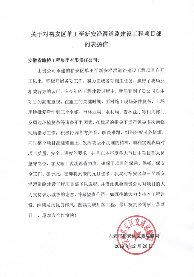 12月20日,路橋集團(tuán)一分公司裕安區(qū)單王至新安沿淠道路建設(shè)工程項(xiàng)目經(jīng)理部收到六安市裕安區(qū)交通運(yùn)輸局發(fā)來的表揚(yáng)信。信中高度贊賞安徽路橋集團(tuán)裕安區(qū)單王至新安沿淠道路建設(shè)工程項(xiàng)目部迎難而上、攻堅(jiān)不畏難的精神,充分肯定了項(xiàng)目部在質(zhì)量控制、安全管理、施工進(jìn)度等方面取得的成績(jī),并對(duì)公司為六安市發(fā)展作出的努力和貢獻(xiàn)表示衷心感謝。
