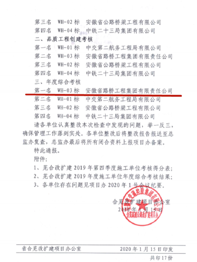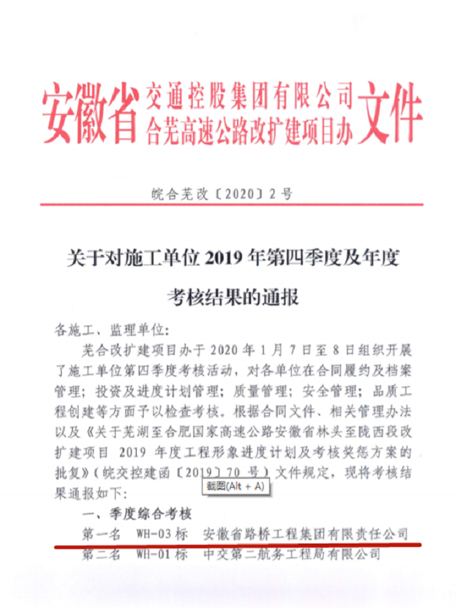 2020年1月16日,蕪合改擴(kuò)建項(xiàng)目辦傳來(lái)喜訊,安徽路橋集團(tuán)蕪合高速改擴(kuò)建三標(biāo)項(xiàng)目在項(xiàng)目辦組織開(kāi)展的施工單位第四季度考核活動(dòng)中喜獲年度綜合考核第一、第四季度綜合考核第一。