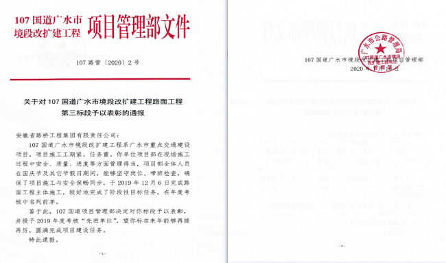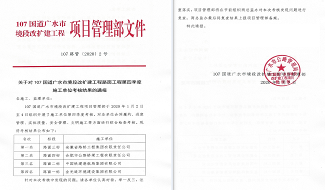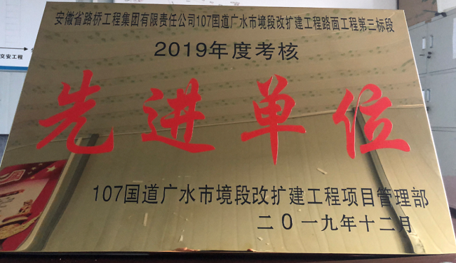 1月7日,湖北107國道廣水市境段改擴(kuò)建項目業(yè)主對四個標(biāo)段進(jìn)行2019年四季度綜合考核,公司承建的路面三標(biāo)榮獲第一名,1月16日,榮獲業(yè)主“2019年度考核先進(jìn)單位”通報表彰,并授予“先進(jìn)單位”獎牌。